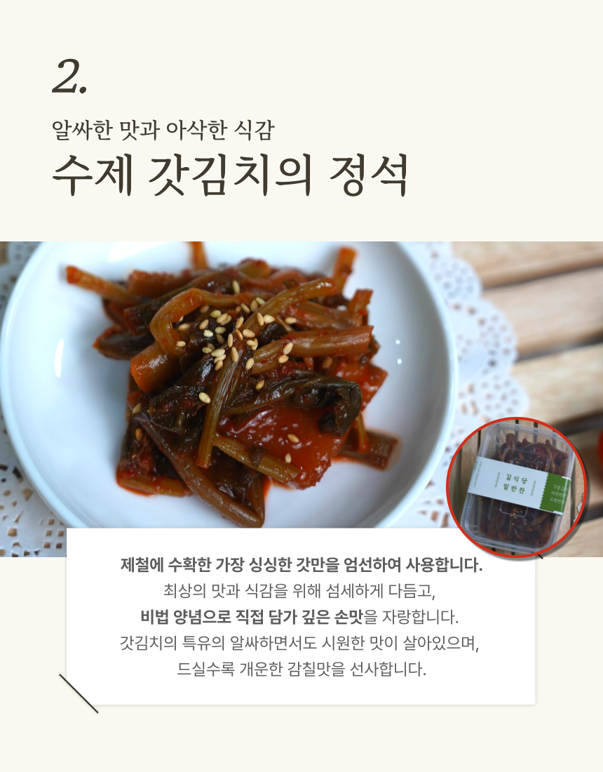 칼로리가 낮고 독특한 향과 맛을 가지고 있는 갓김치! 엄마 손맛이 그리울 땐~ 길식당밑반찬 한번 드셔보세요! (0)