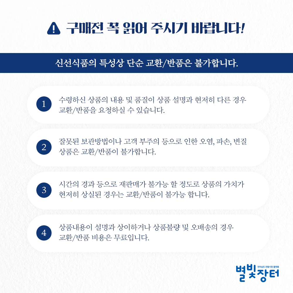 품질보증 기준에 관하여, 전자상거래 법 등에서의 소비자 보호에 관한 법률로 규정되어 있는 소비자 청약 처리 가능 범위에 해당하는 경우에 한하여 반품/ 교환 신청을 처리해 드리고 있습니다. 상품 하자 시 판매자와 필히 연락하셔야 하며 임의로 반품할 시엔 왕복 택배비가 고객님께 부과됨을 알려드립니다. 교환 및 반품은 판매자와 통화 후 수령일로부터 7일 이내에 발송해 주셔야 합니다.