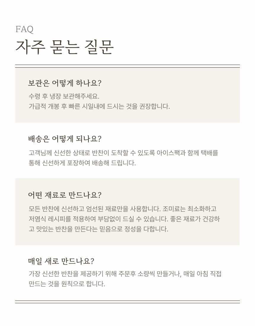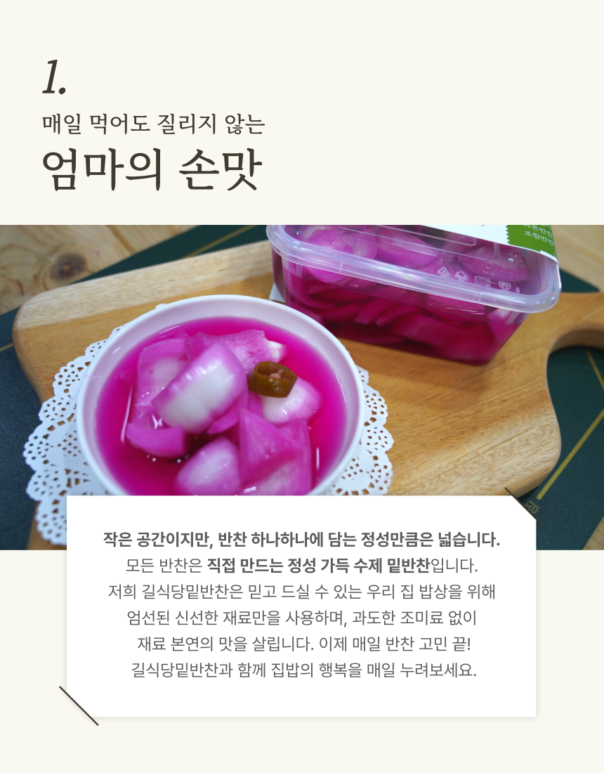 아삭한 양파의 청량함과 비트의 고운 빛깔이 만나,새콤달콤하면서도 깔끔한 맛을 선사합니다. 작은 공간이지만 반찬 하나하나에 정성만큼은 넓습니다. (0)