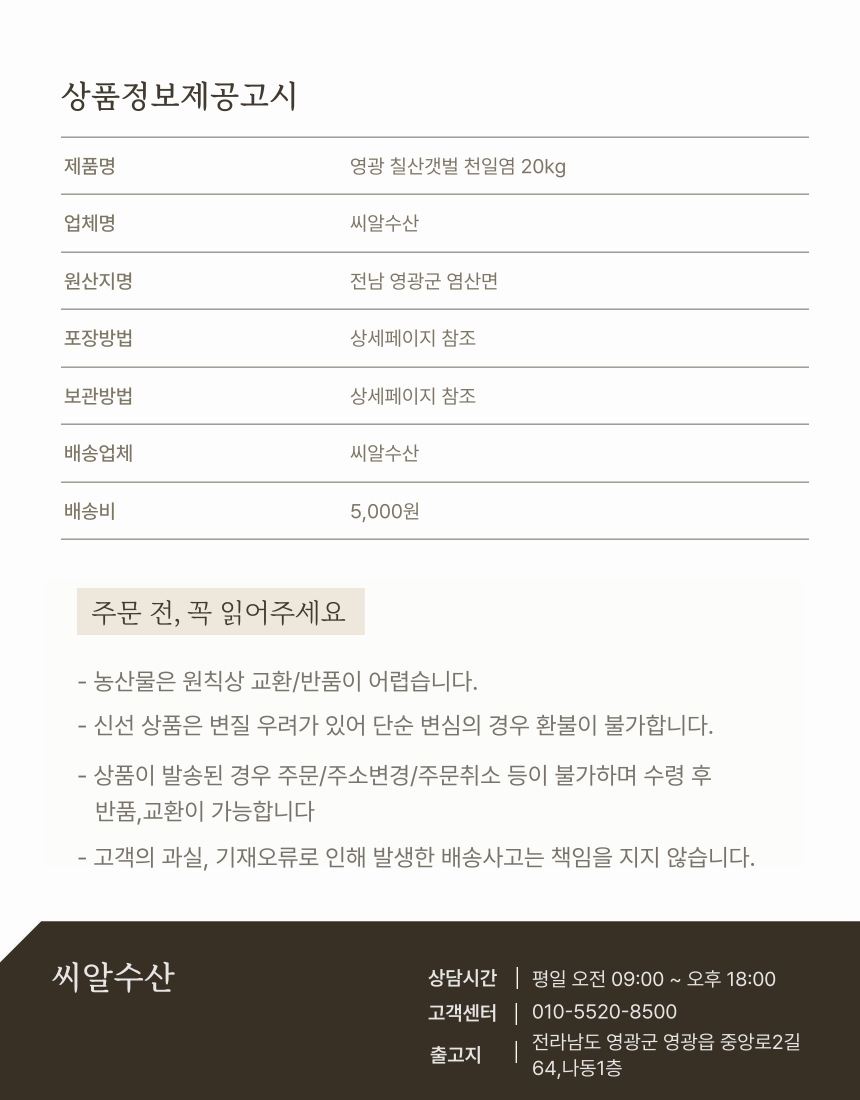 씨알수산 전남 영광칠산갯벌 천일염 20kg