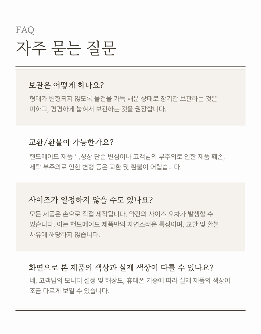 품질보증 기준에 관하여, 전자상거래 법 등에서의 소비자 보호에 관한 법률로 규정되어 있는 소비자 청약 처리 가능 범위에 해당하는 경우에 한하여 반품/ 교환 신청을 처리해 드리고 있습니다. 상품 하자 시 판매자와 필히 연락하셔야 하며 임의로 반품할 시엔 왕복 택배비가 고객님께 부과됨을 알려드립니다. 교환 및 반품은 판매자와 통화 후 수령일로부터 7일 이내에 발송해 주셔야 합니다.
