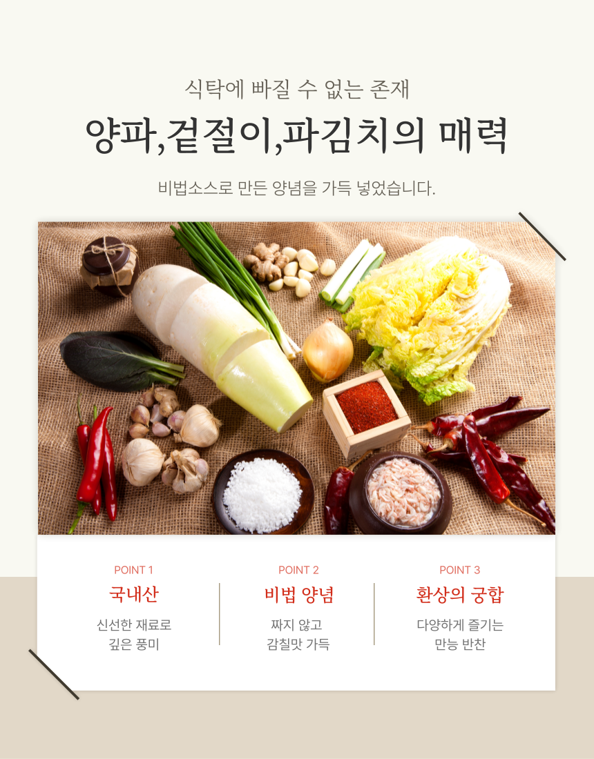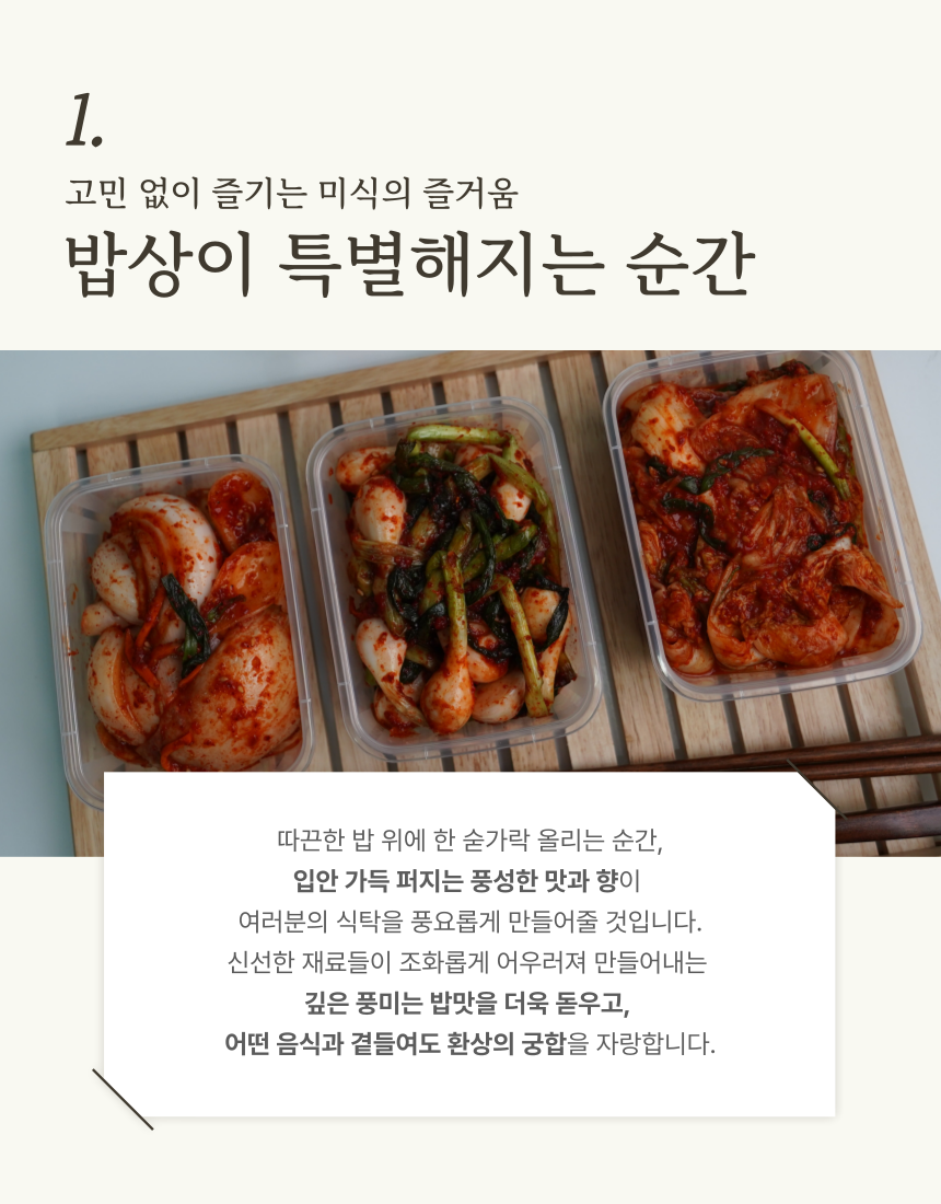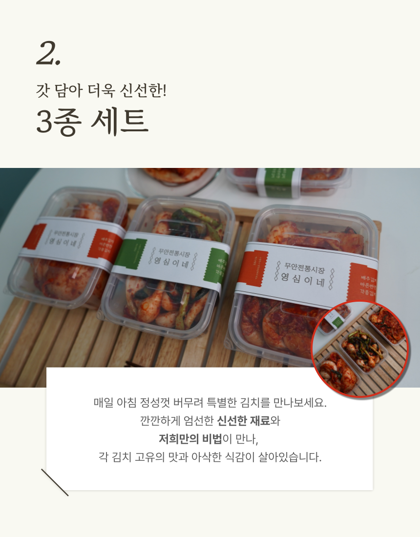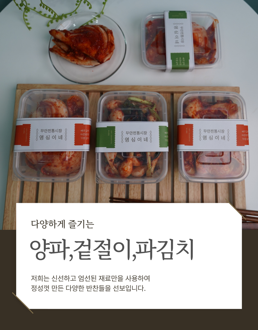 다양하게 즐기는 김치 3종 세트 (양파김치 1kg + 겉절이김치 1kg + 파김치 800g - 장날닷컴, 전남스마트전통시장