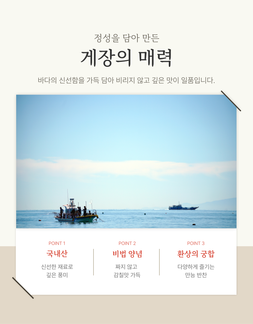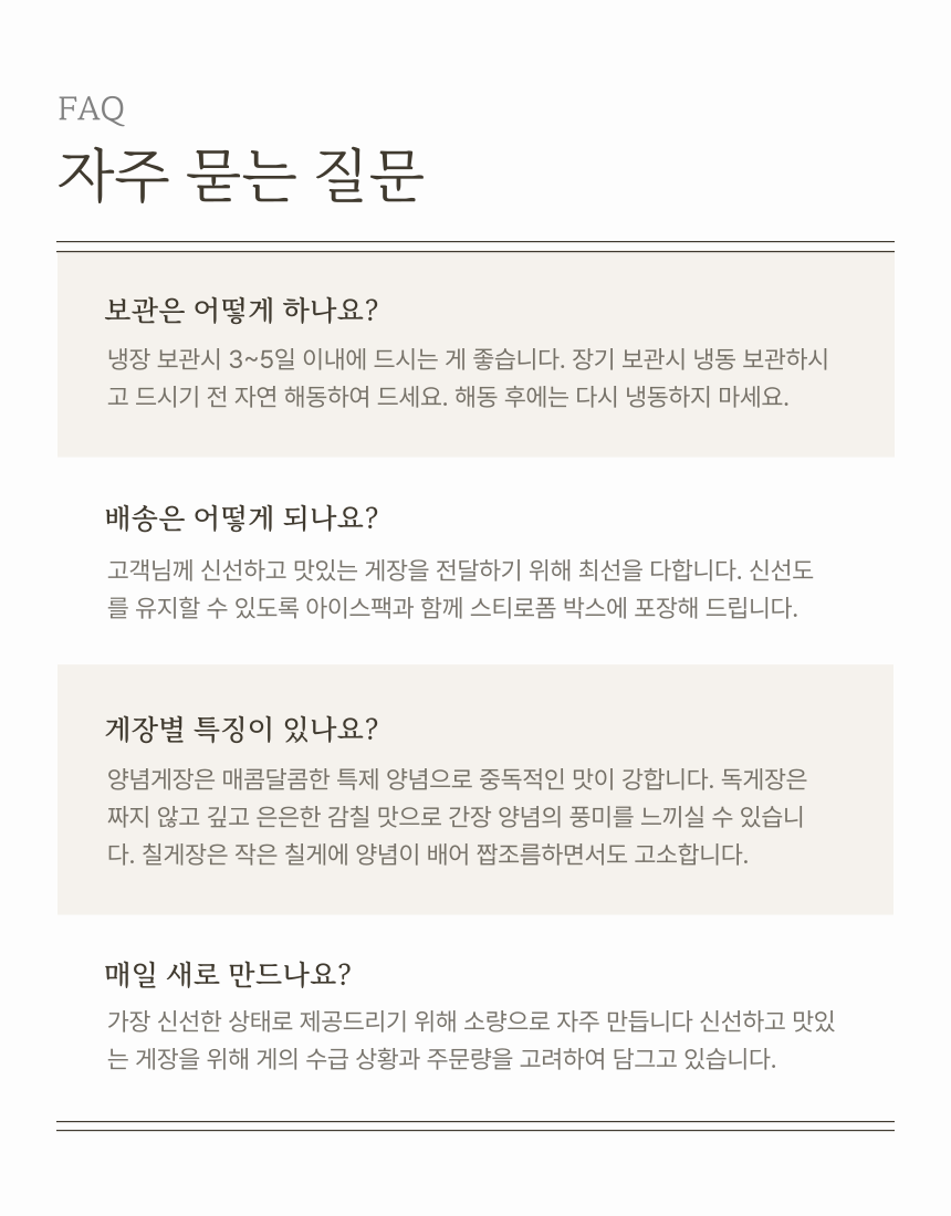 신선한 재료들이 조화롭게 어우러져 깊은 풍미는 밥맛을 더욱 돋우고, 어떤 음식과 곁들여도 환상의 궁합을 자랑하는 게장 3종세트입니다 (0)
