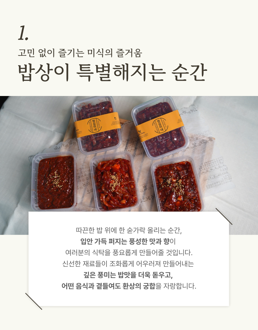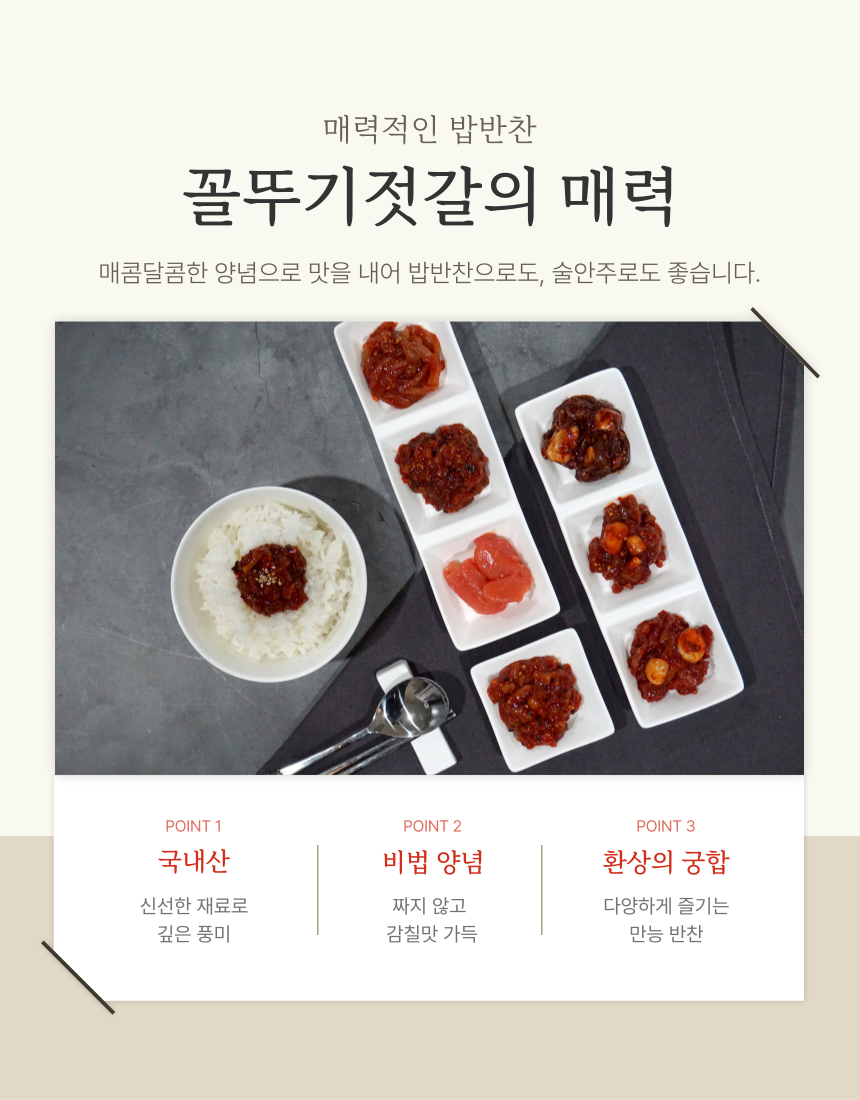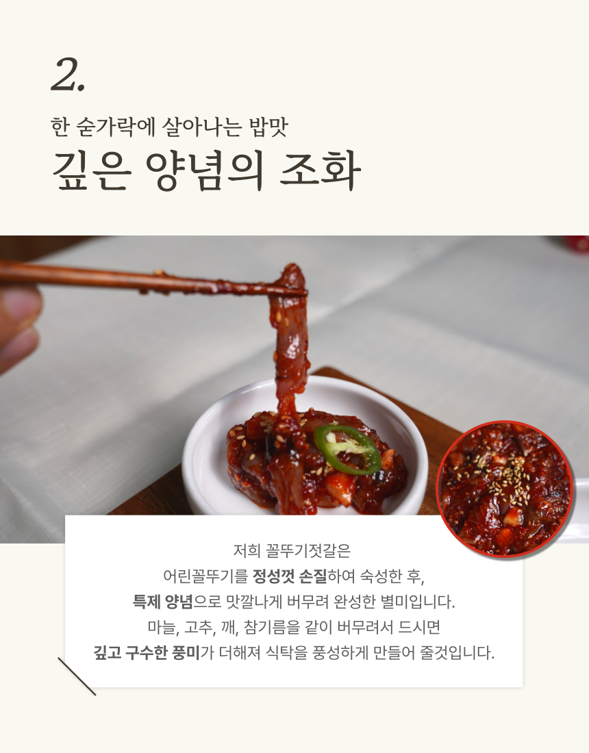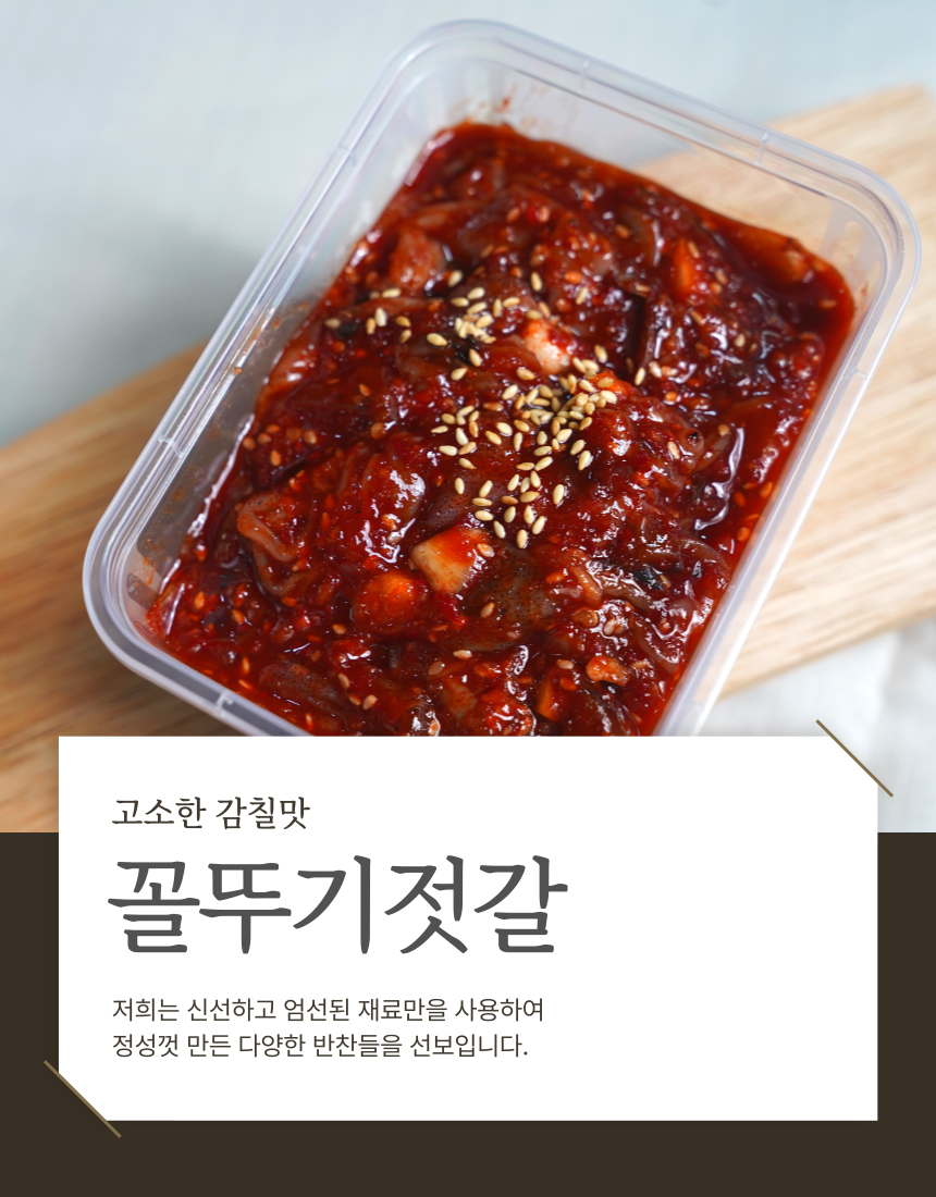 신선한 재료들이 조화롭게 어우러져 깊은 풍미는 밥맛을 더욱 돋우고, 꼬소하고 쫄깃한 맛이 일품인 꼴뚜기젓갈입니다 (0)