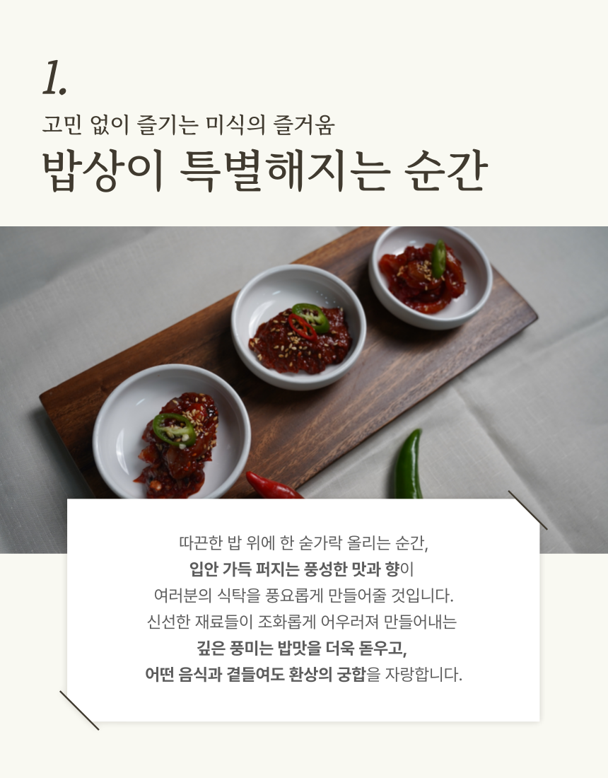 신선한 재료들이 조화롭게 어우러져 깊은 풍미는 밥맛을 더욱 돋우고, 어떤 음식과 곁들여도 환상의 궁합을 자랑하는 게장 3종세트입니다 (0)