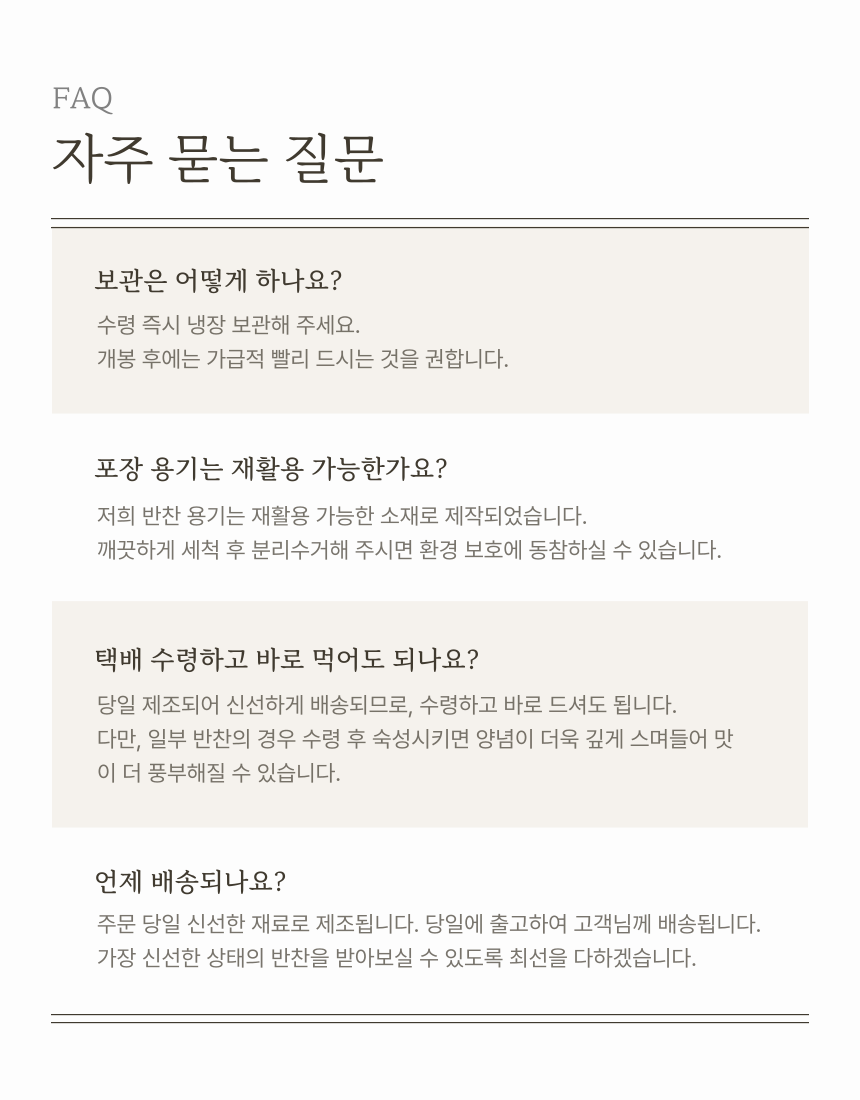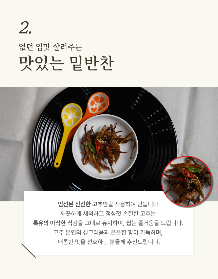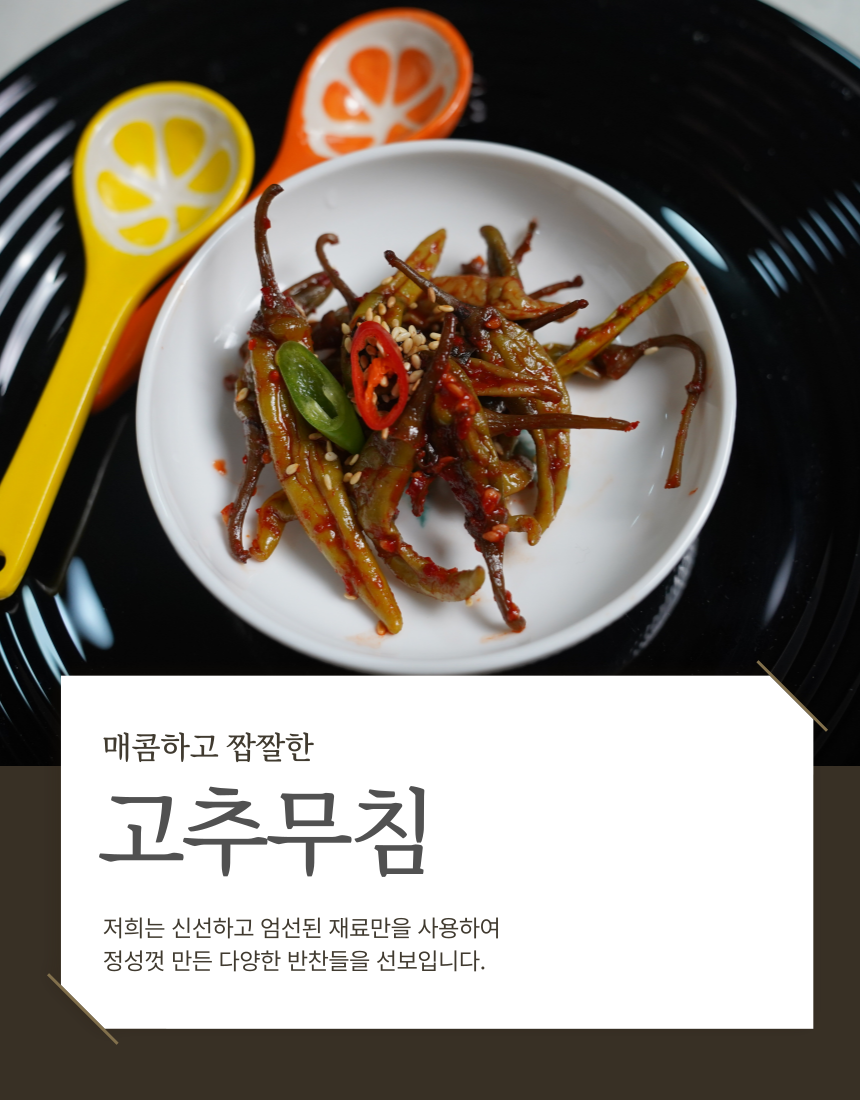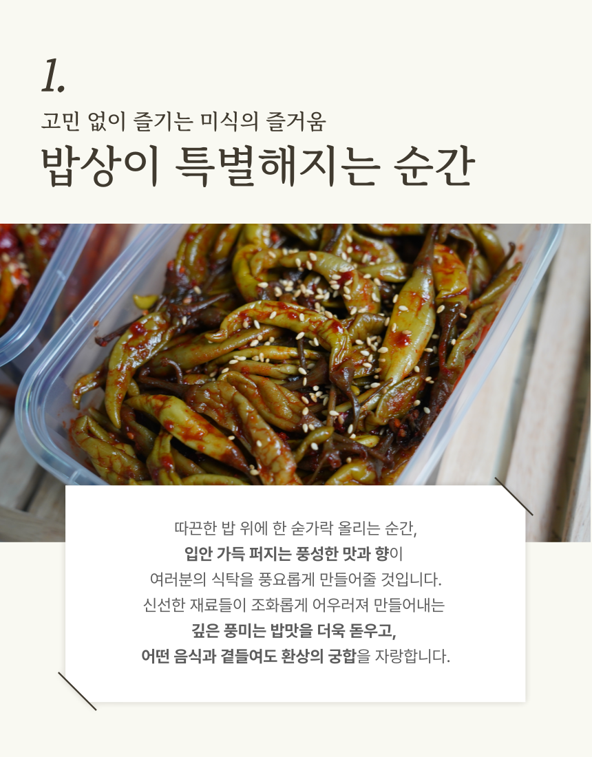 신선한 재료들이 조화롭게 어우러져 깊은 풍미는 밥맛을 더욱 돋우고, 어떤 음식과 곁들여도 환상의 궁합을 자랑하는 고추장아찌 입니다 (0)