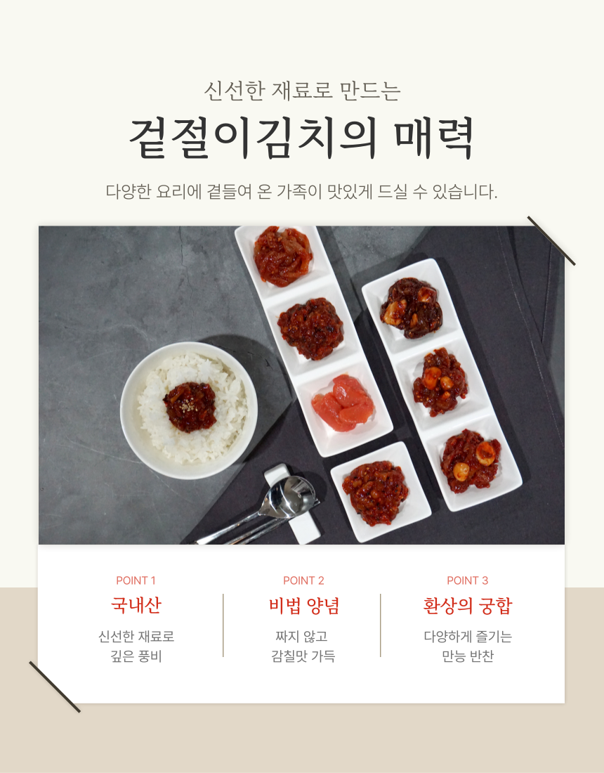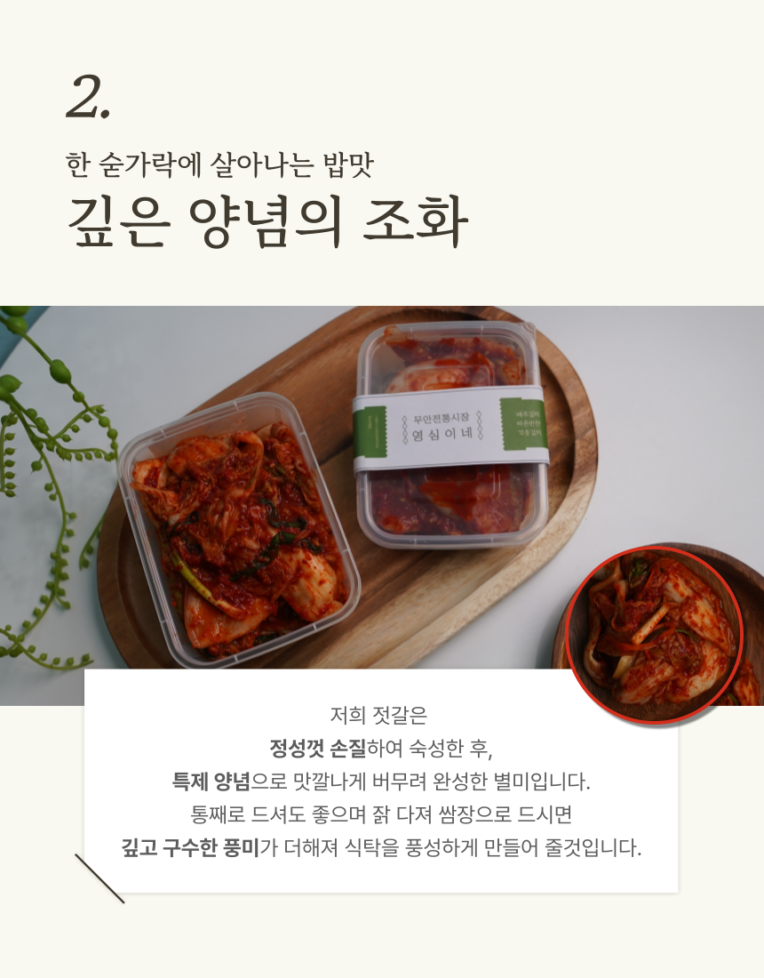 신선한 재료들이 조화롭게 어우러져 깊은 풍미는 밥맛을 더욱 돋우고, 어떤 음식과 곁들여도 환상의 궁합을 자랑하는 알배추 겉절이 입니다 (0)