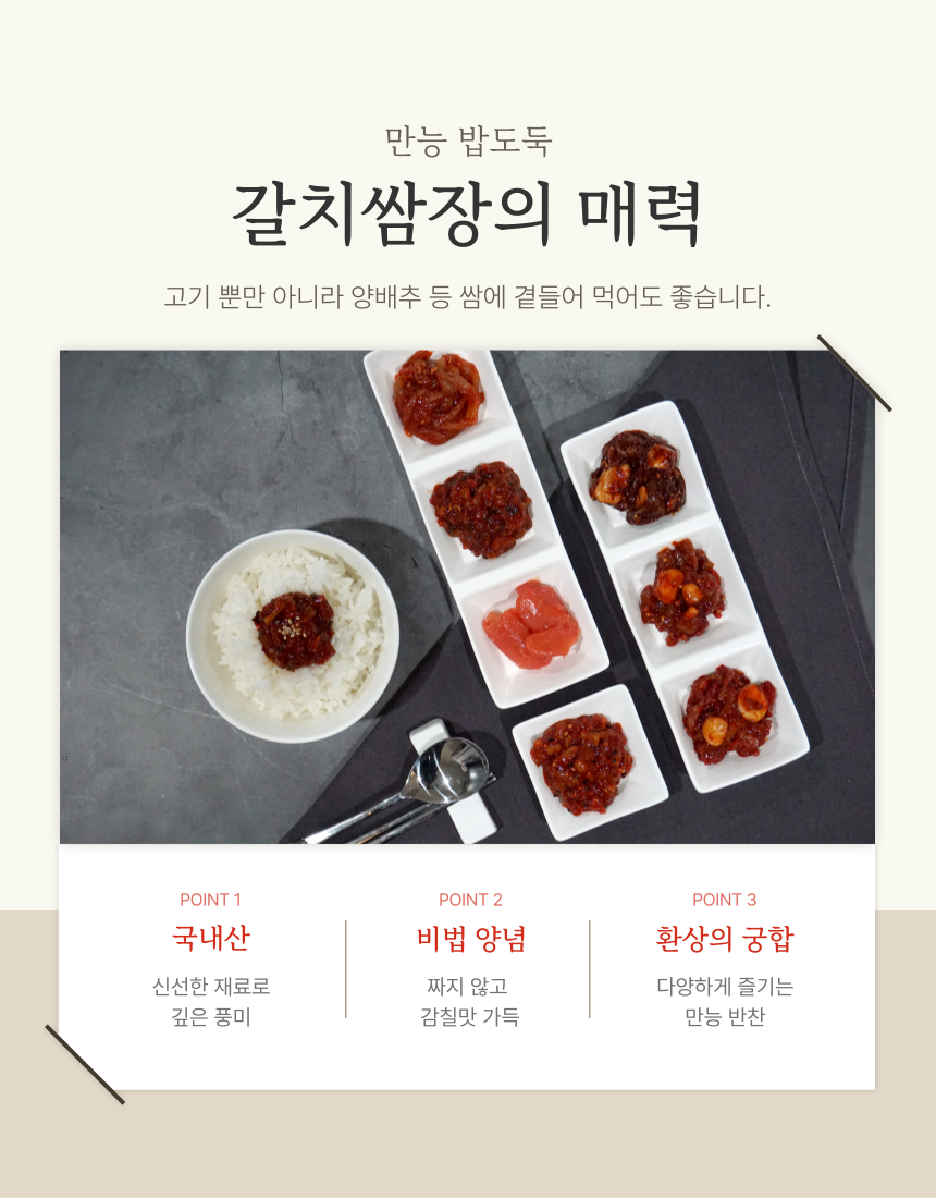 신선한 재료들이 조화롭게 어우러져 깊은 풍미는 밥맛을 더욱 돋우고, 삼겹살과 곁들여도 환상의 궁합을 자랑하는 갈치속젓입니다 (0)