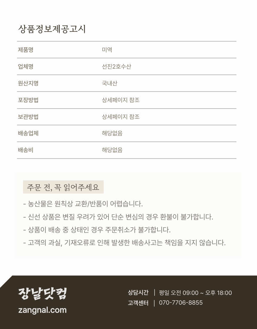 청정지역에서 생산된 상품만을 엄선하여 신선한 상품을 정직하고 합리적인 가격으로 제공하고 있습니다 (0)