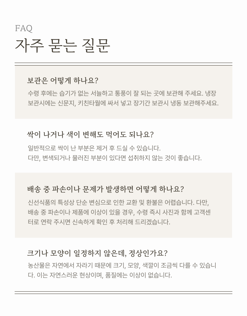 품질보증 기준에 관하여, 전자상거래 법 등에서의 소비자 보호에 관한 법률로 규정되어 있는 소비자 청약 처리 가능 범위에 해당하는 경우에 한하여 반품/ 교환 신청을 처리해 드리고 있습니다. 상품 하자 시 판매자와 필히 연락하셔야 하며 임의로 반품할 시엔 왕복 택배비가 고객님께 부과됨을 알려드립니다. 교환 및 반품은 판매자와 통화 후 수령일로부터 7일 이내에 발송해 주셔야 합니다.